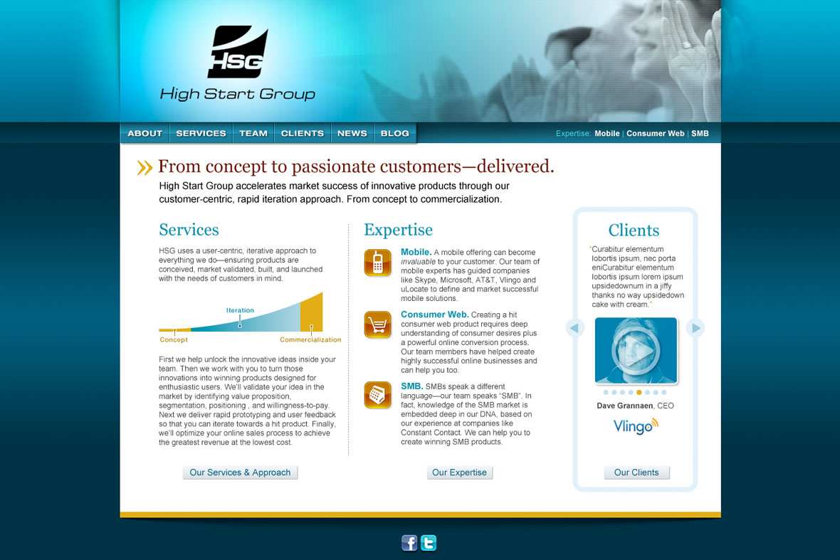High Start Group is a consulting company that helps their clients accelerate the success of their innovations by leveraging  its unique customer-centric and data-driven approach. HSG works closely with them to rapidly conceive, validate, and launch products that customers will love.